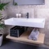 Let op: Deze foto is slechts een sfeerfoto. Het meubel komt dus exclusief de spiegel en de kranen. Mooie accessoires die aan het meubel toegevoegd kunnen worden, zijn te vinden onder de toebehoren.