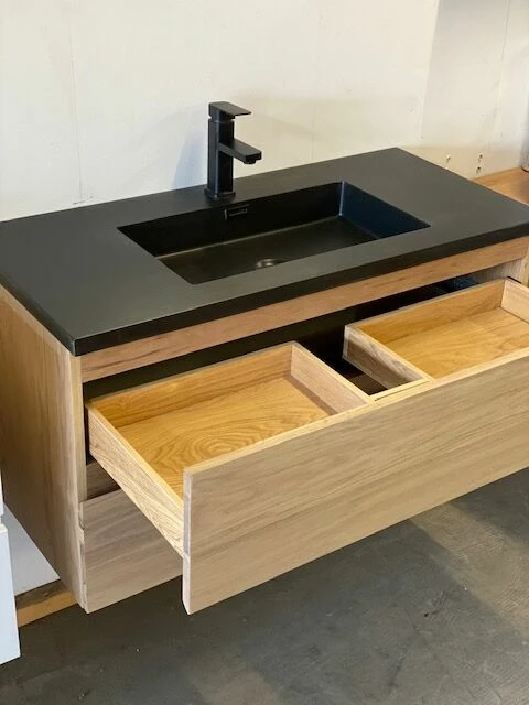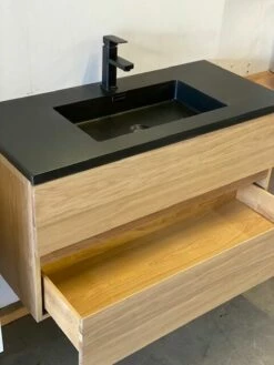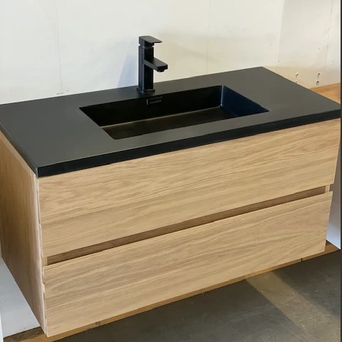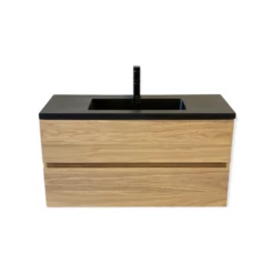 Ga in je badkamer voor een naturele look met een industriële touch met dit B-Stone Nevada badkamermeubel. Het meubel is gemaakt van eiken, wat zorgt voor warmte en sfeer in de badkamer. De zwarte grote inbouw wastafel geeft het badmeubel een industriële look. De greeploze lades zorgen daarentegen voor rust in het meubel.