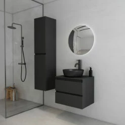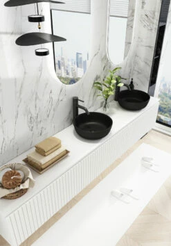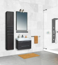 Dit staande badkamermeubel Resly van Badstuber is een compact meubel met niet teveel poespas. Het badkamermeubel bestaat uit de onderkast, de wastafel en de spiegel. Aan de voorkant kun je de 2 deuren openen met de chromen handvatten. De wastafel heeft een witte kleur en bevindt zich in het midden van het meubel. Maak het badkamermeubel af met de toebehoren.