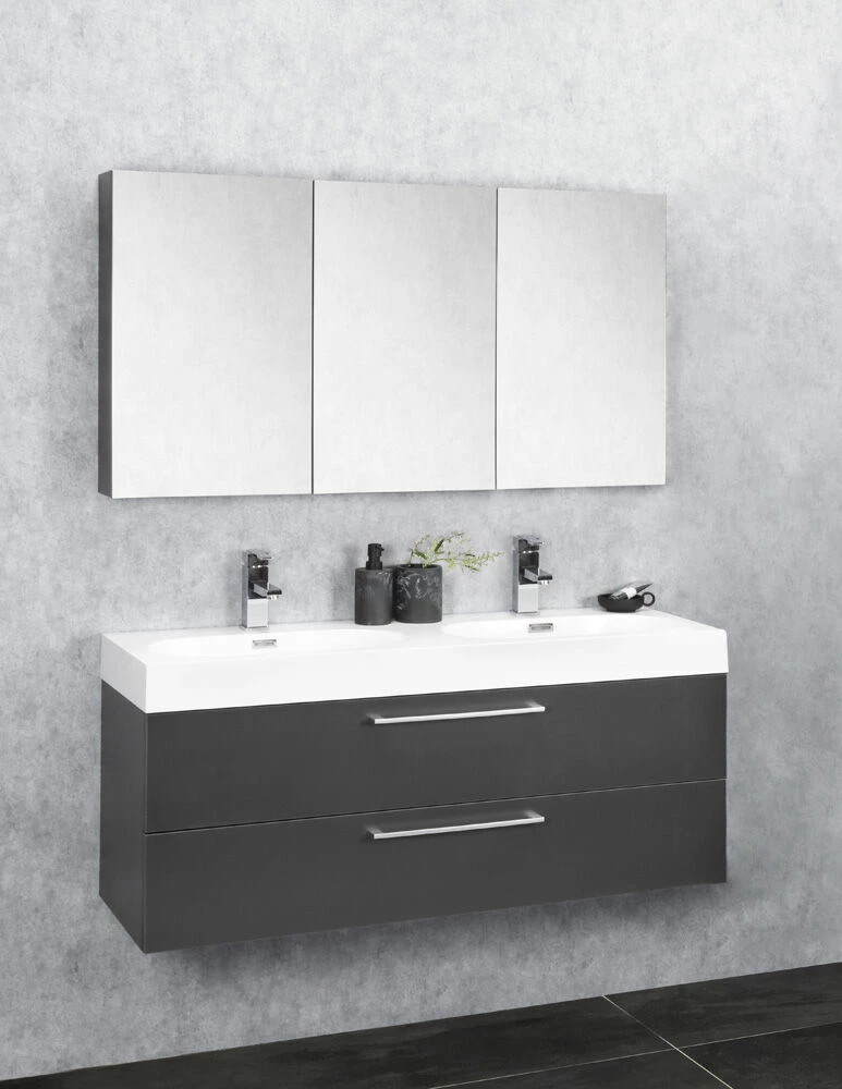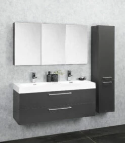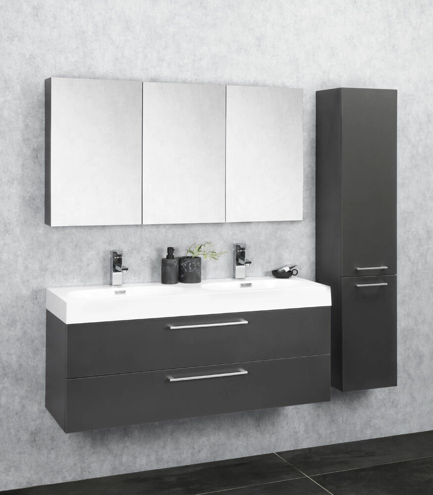 Een badmeubel met een tijdloos design is de Differnz badmeubel uit de serie Somero. In de set zit een badkamermeubel, een wastafel en een spiegelkast. Het badmeubel heeft een breedte 120cm. Perfect voor in een wat kleinere badkamer. De wastafel is gemaakt van kunststeen, een materiaal dat onderhoudsvrij is en dankzij de kleur ook tijdloos is.Â