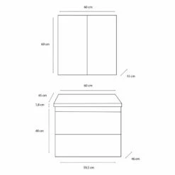 Het badmeubel is 60cm breed, de spiegelkast heeft dezelfde breedte. De kleur van het badmeubel is doorgetrokken naar de spiegelkast. De wastafel is gemaakt van keramiek, heeft 1 kraangat en een overloop. De spiegelkast heeft geen verlichting.
