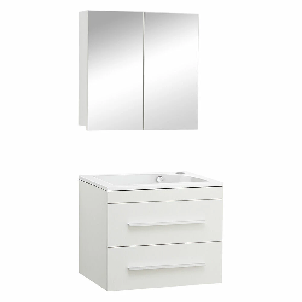 Het badmeubel is 60cm breed, de spiegelkast heeft dezelfde breedte. De kleur van het badmeubel is doorgetrokken naar de spiegelkast. De wastafel is gemaakt van keramiek, heeft 2 kraangaten en een overloop. De spiegelkast heeft geen verlichting.