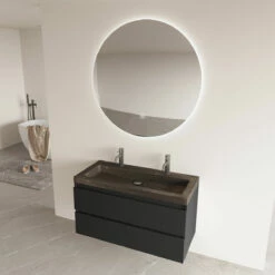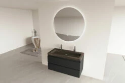 Met het Freestone badkamermeubel van Fontana haal je een parel in huis. Deze badkamermeubelset bestaat uit een onderkast met een gave natuurstenen wastafel en een ronde spiegel met verlichting. De natuurstenen wastafel geeft het meubel een stoer tintje, zeker in combinatie met de zwarte onderkast.