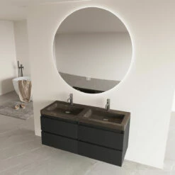 Met het Freestone badkamermeubel van Fontana haal je een parel in huis. Deze badkamermeubelset bestaat uit een onderkast met een gave natuurstenen wastafel en een ronde spiegel met verlichting. De natuurstenen wastafel geeft het meubel een stoer tintje, zeker in combinatie met de zwarte onderkast.