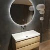 De spiegel uit deze set is de Saniclear Circle. Deze ronde spiegel is uitgerust met LED-verlichting én spiegelverwarming. Je bedient de spiegel door middel van de touch knop op de spiegel. Door één keer op de knop te drukken, activeer je de verlichting, met twee keer drukken activeer je ook de spiegelverwarming. Ook kun je de spiegel dimmen door de knop ingedrukt te houden. Een echt plaatje in jouw badkamer dus!