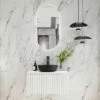 De natuurstenen wastafel maakt het meubel af. Doordat de wastafel gemaakt is van natuursteen, is het materiaal poreus van zichzelf. Hierdoor dient het geïmpregneerd te worden, zodat er een soort van beschermlaag op aangebracht wordt. Bepaalde stoffen kunnen er hierdoor niet in trekken. Hierdoor geniet je éxtra lang van jouw wastafel. Pas op met agressieve schoonmaakmiddelen, dit tast jouw wastafel aan. Vermijd deze middelen ten alle tijden. Het perfecte reinigingsmiddel voor deze wastafel vind je in de toebehoren, net als het impregneermiddel. In de wastafel zit geen kraangat. Zo combineer je het meubel prachtig met een inbouw wastafelkraan naar keuze!
