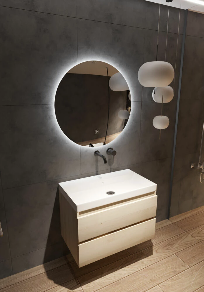 De spiegel uit deze set is de Saniclear Circle. Deze ronde spiegel is uitgerust met LED-verlichting én spiegelverwarming. Je bedient de spiegel door middel van de touch knop op de spiegel. Door één keer op de knop te drukken, activeer je de verlichting. Met twee keer drukken activeer je ook de spiegelverwarming. Ook kun je de spiegel dimmen door de knop ingedrukt te houden. Deze spiegel maakt jouw Kolo badkamermeubel compleet!
