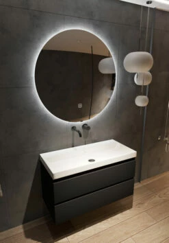 De spiegel uit deze set is de Saniclear Circle. Deze ronde spiegel is uitgerust met LED-verlichting én spiegelverwarming. Je bedient de spiegel door middel van de touch knop op de spiegel. Door één keer op de knop te drukken, activeer je de verlichting. Met twee keer drukken activeer je ook de spiegelverwarming. Ook kun je de spiegel dimmen door de knop ingedrukt te houden. Deze spiegel maakt jouw Kolo badkamermeubel compleet!