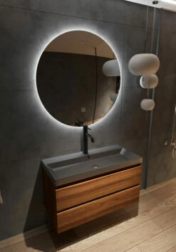De spiegel uit deze set is de Saniclear Circle. Deze ronde spiegel is uitgerust met LED-verlichting én spiegelverwarming. Je bedient de spiegel door middel van de touch knop op de spiegel. Door één keer op de knop te drukken, activeer je de verlichting. Met twee keer drukken activeer je ook de spiegelverwarming. Ook kun je de spiegel dimmen door de knop ingedrukt te houden. Deze spiegel maakt jouw Kolo badkamermeubel compleet!