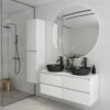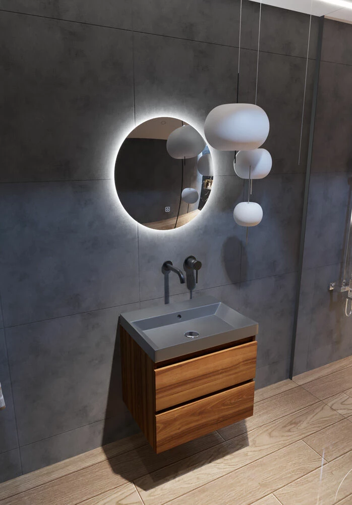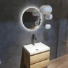 De spiegel uit deze set is de Saniclear Circle. Deze ronde spiegel is uitgerust met LED-verlichting én spiegelverwarming. Je bedient de spiegel door middel van de touch knop op de spiegel. Door één keer op de knop te drukken, activeer je de verlichting. Met twee keer drukken activeer je ook de spiegelverwarming. Ook kun je de spiegel dimmen door de knop ingedrukt te houden. Deze spiegel maakt jouw Kolo badkamermeubel compleet!