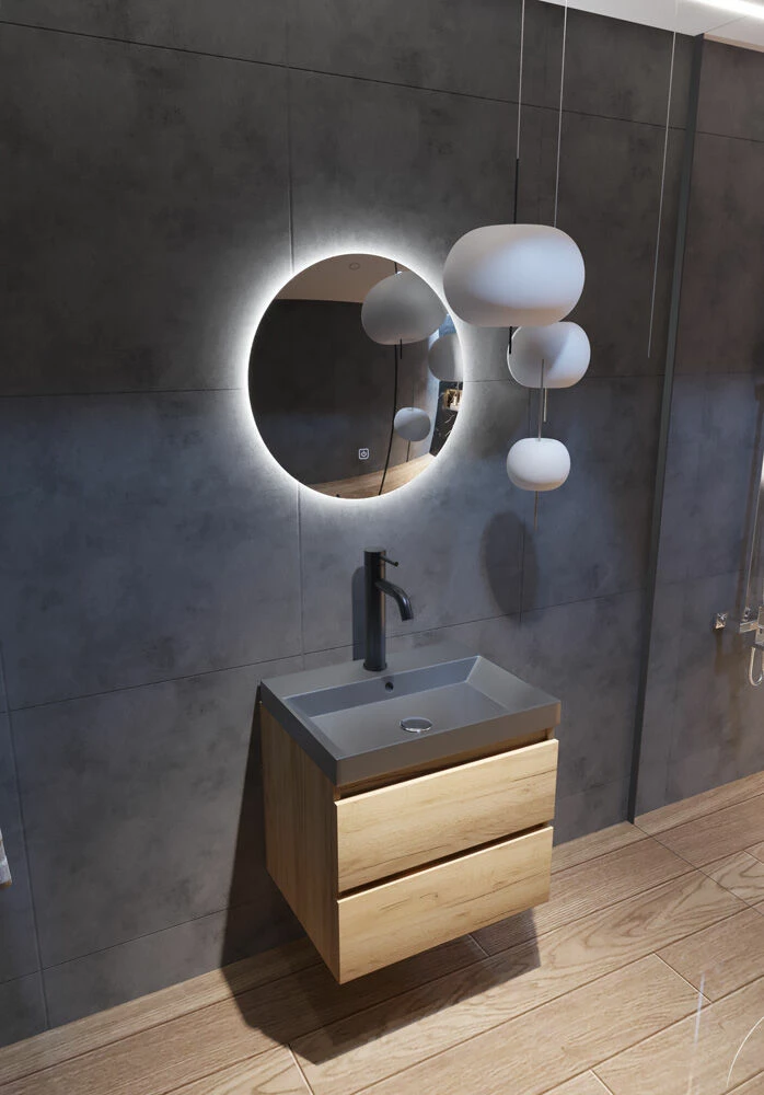 De spiegel uit deze set is de Saniclear Circle. Deze ronde spiegel is uitgerust met LED-verlichting én spiegelverwarming. Je bedient de spiegel door middel van de touch knop op de spiegel. Door één keer op de knop te drukken, activeer je de verlichting. Met twee keer drukken activeer je ook de spiegelverwarming. Ook kun je de spiegel dimmen door de knop ingedrukt te houden. Deze spiegel maakt jouw Kolo badkamermeubel compleet!