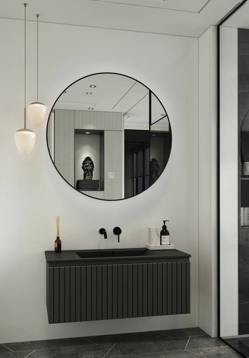 Nog een extraatje: De set komt met de gave, ronde, zwarte spiegel. De spiegel uit deze set is de Saniclear Circle Black. Deze ronde spiegel is uitgerust met een zwart frame, LED-verlichting én spiegelverwarming. Je bedient de spiegel door middel van de touch knop op de spiegel. Door één keer op de knop te drukken activeer je de verlichting, met twee keer drukken activeer je ook de spiegelverwarming. Ook kun je de spiegel dimmen door de knop ingedrukt te houden. Een perfecte combinatie met het meubel en daardoor een echt plaatje in jouw badkamer!