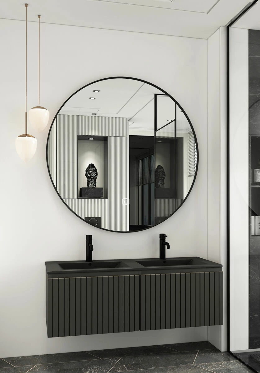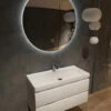Nog een extraatje: De set komt met de gave, ronde, zwarte spiegel. De spiegel uit deze set is de Saniclear Circle Black. Deze ronde spiegel is uitgerust met een zwart frame, LED-verlichting én spiegelverwarming. Je bedient de spiegel door middel van de touch knop op de spiegel. Door één keer op de knop te drukken activeer je de verlichting, met twee keer drukken activeer je ook de spiegelverwarming. Ook kun je de spiegel dimmen door de knop ingedrukt te houden. Een perfecte combinatie met het meubel en daardoor een echt plaatje in jouw badkamer!
