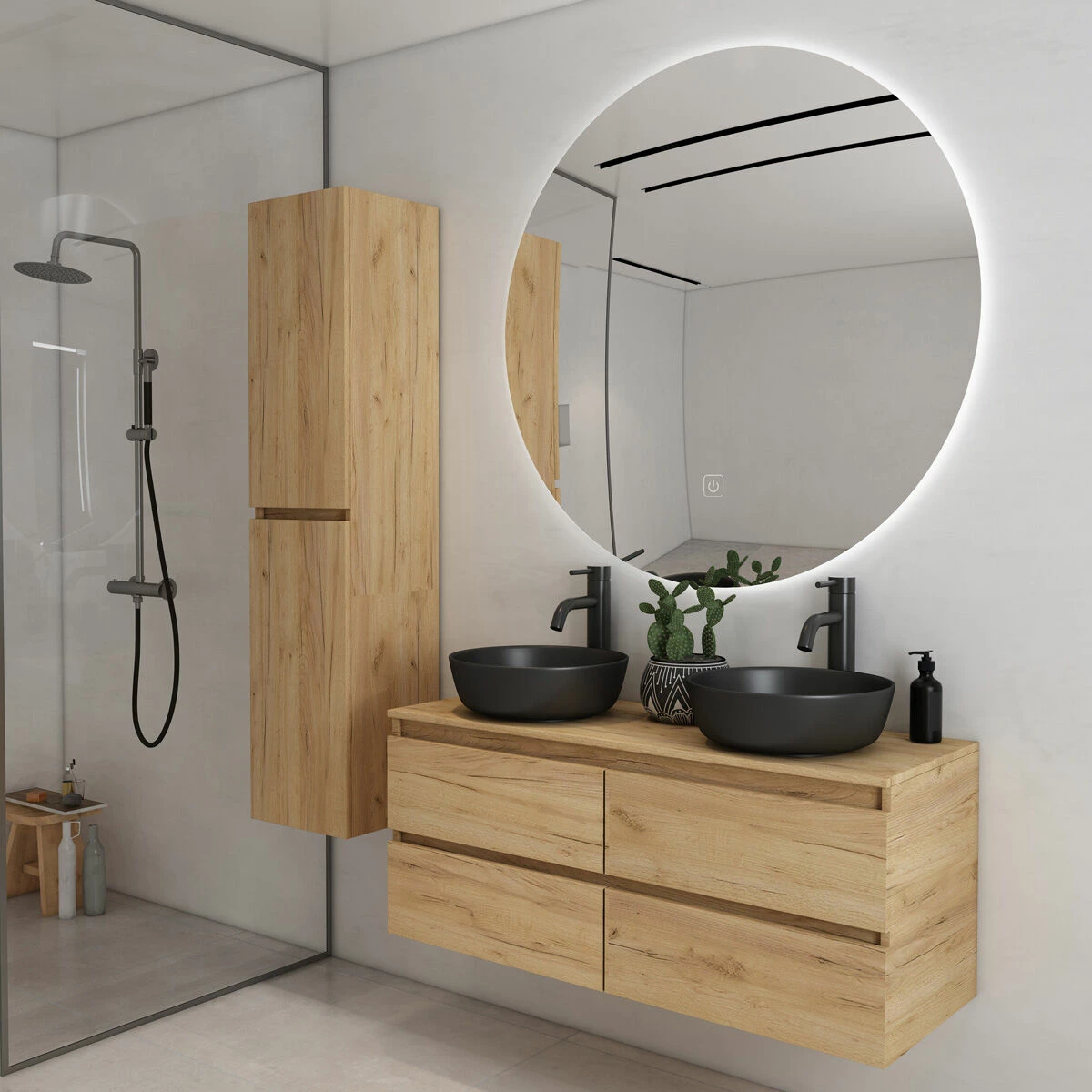 De spiegel uit deze set is de Saniclear Circle. Deze ronde spiegel is uitgerust met LED-verlichting én spiegelverwarming. Je bedient de spiegel door middel van de touch knop op de spiegel. Door één keer op de knop te drukken activeer je de verlichting, met twee keer drukken activeer je ook de spiegelverwarming. Ook kun je de spiegel dimmen door de knop ingedrukt te houden. Een echt plaatje in jouw badkamer dus!