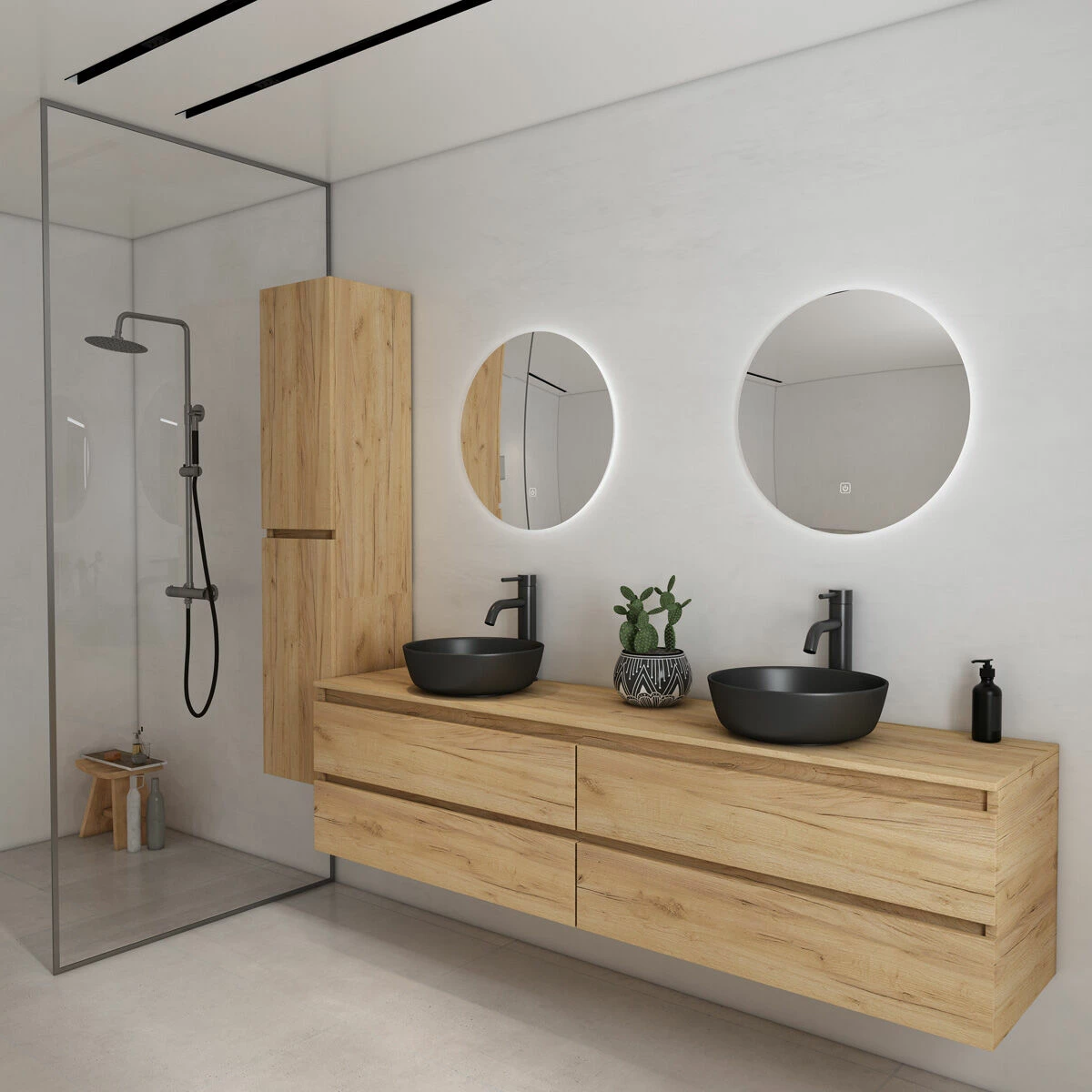 Een badkamer is niet compleet zonder een mooi én tijdloos badkamermeubel. Het merk Fontana heeft prachtige meubels uitgebracht waaronder deze parel. De Proma serie van Fontana bestaat uit een badkamermeubel in meerdere kleuren, die je kan combineren met de Fontana Rovigo kolomkast. Voor ’t gemak is het meubel al voorzien van matzwarte keramische waskommen én twee spiegels met LED-verlichting. Maak het badkamermeubel helemaal af met een bijpassende wastafelkranen. In het meubel zitten geen kraangaten. Zo kan je er zelf voor kiezen of je voor staande wastafelkranen of een inbouw wastafelkranen gaat.