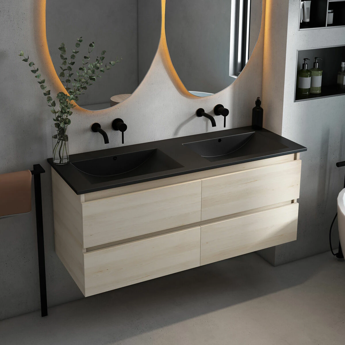 In de wastafel zitten er 2 overlopen. Hierdoor stroomt jouw wastafel nooit over want het water wat boven de overlopen uitkomt, stroomt via de overlopen weg. Er zitten standaard chromen overloopringen in de wastafel. Bijpassende zwarte ringen vind je in de toebehoren. In de wastafel zitten geen kraangaten. Zo combineer je het meubel prachtig met twee inbouw wastafelkranen naar keuze!