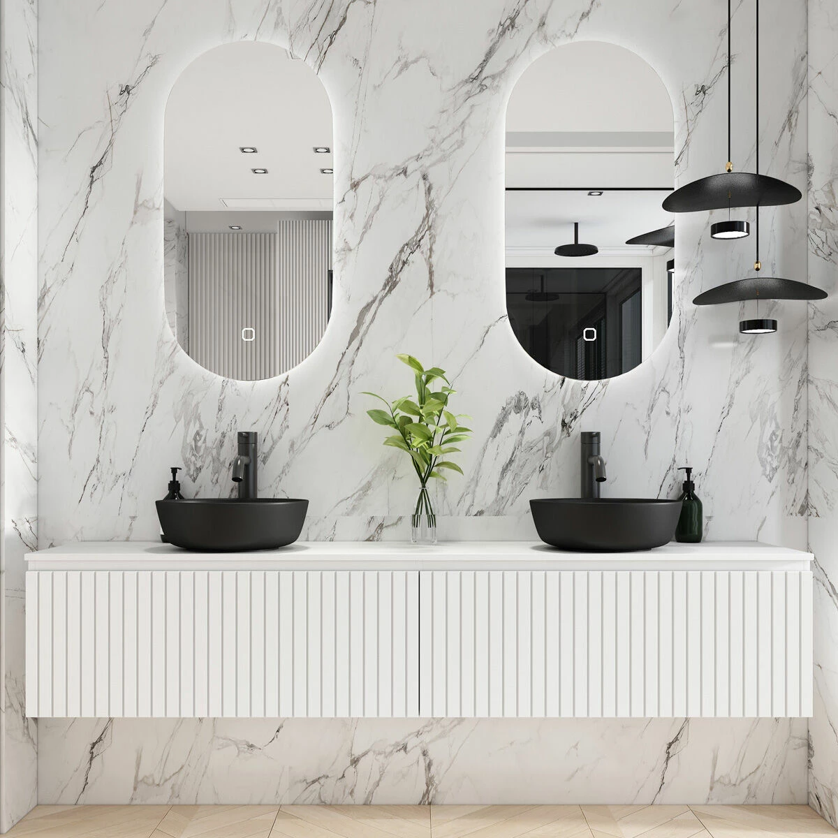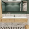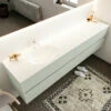 In het topblad zitten geen kraangaten of afvoergaten voor de waskommen. Zo kan je helemaal zelf kiezen waar de waskommen komen en of je gaat voor inbouw- of staande wastafelkranen. Het handige aan een mat wit meubel is dat elke wastafelkraan en waskom hier wel bij past. Ga jij voor een stoere zwarte wastafelkraan, of juist voor een rustige verouderd ijzeren wastafelkraan in combinatie met een zwarte, ronde waskom? Aan jou de keuze!