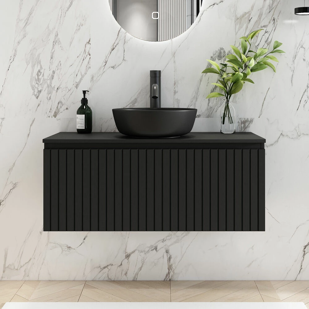 In het topblad zit geen kraangat of een afvoergat voor de waskom. Zo kan je helemaal zelf kiezen waar de waskom komt en of je gaat voor een inbouw of een staande wastafelkraan. Het handige aan een matzwart meubel is dat elke wastafelkraan en waskom hier wel bij past. Ga jij voor een shiny gouden wastafelkraan, of juist voor een rustige verouderd ijzeren wastafelkraan in combinatie met een zwarte, ronde waskom? Aan jou de keuze!
