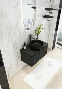 In het topblad zit geen kraangat of een afvoergat voor de waskom. Zo kan je helemaal zelf kiezen waar de waskom komt en of je gaat voor een inbouw of een staande wastafelkraan. Het handige aan een matzwart meubel is dat elke wastafelkraan en waskom hier wel bij past. Ga jij voor een shiny gouden wastafelkraan, of juist voor een rustige verouderd ijzeren wastafelkraan in combinatie met een zwarte, ronde waskom? Aan jou de keuze!