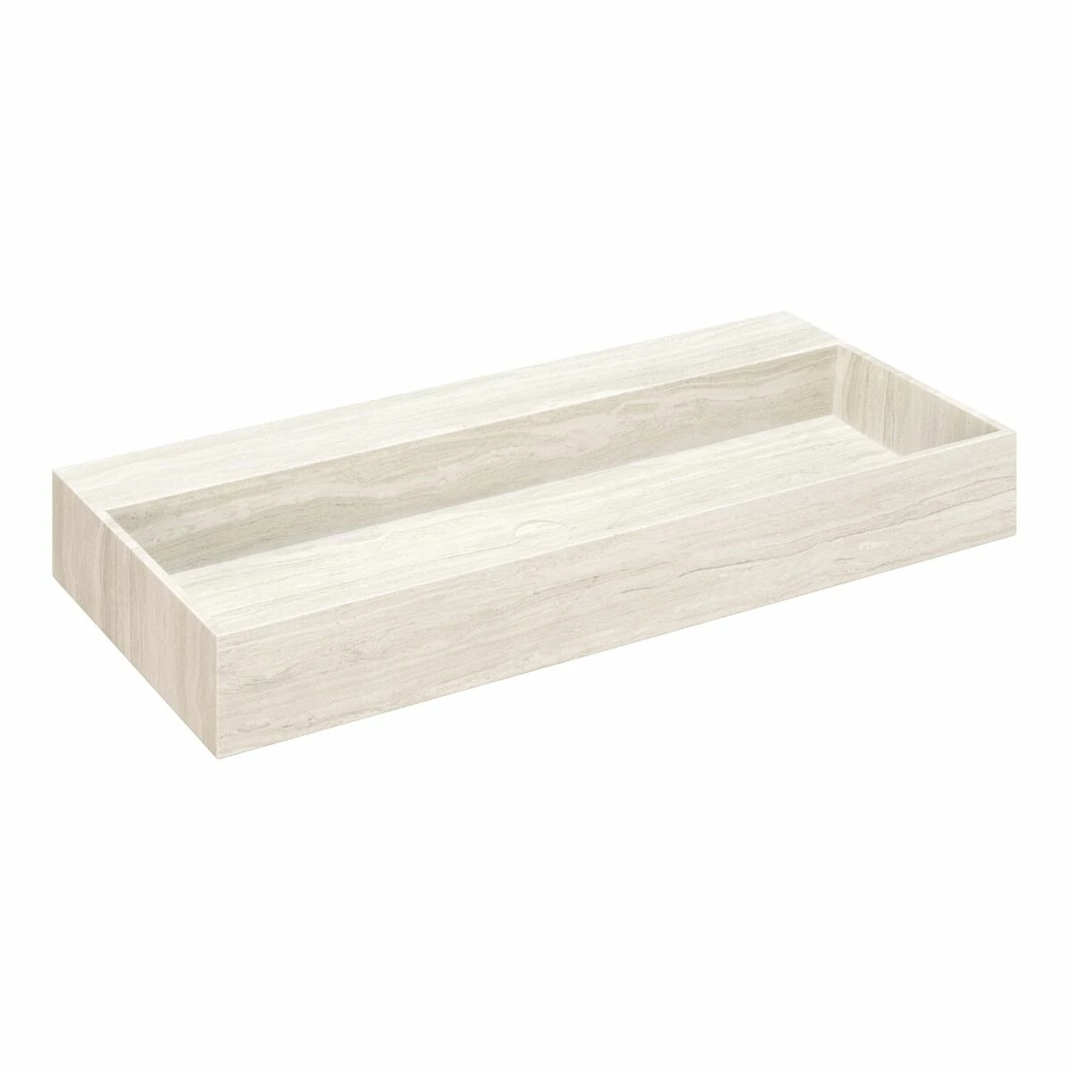 De wastafel maakt dit meubel pas écht bijzonder. Het is namelijk gemaakt van een natuursteen, ook wel travertin genoemd. Travertin geeft warmte aan je interieur en past door zijn tint perfect in de ton-sur-ton stijlen. Een wastafel van travertin is een zoetwaterkalksteen en heeft als eigenschap dat het een grovere structuur heeft, in vergelijking met een wastafel van marmer. De grovere structuur ontstaat door takjes en/of bladeren, die in het water terecht zijn gekomen en later zijn verteerd, wat poriën creëert. Omdat poriën in een wastafel normaal gesproken zorgen voor een ophoping van vuil en kalk, is deze wastafel in de fabriek gevuld met epoxy steenlijm. De grote poriën worden met het epoxy gevuld en hierdoor krijgen vuil en kalk geen mogelijkheid om zich te binden in de poriën. Toch blijven er wel wat kleine poriën in de steen zichtbaar, waardoor de natuurlijke uitstraling behouden blijft.