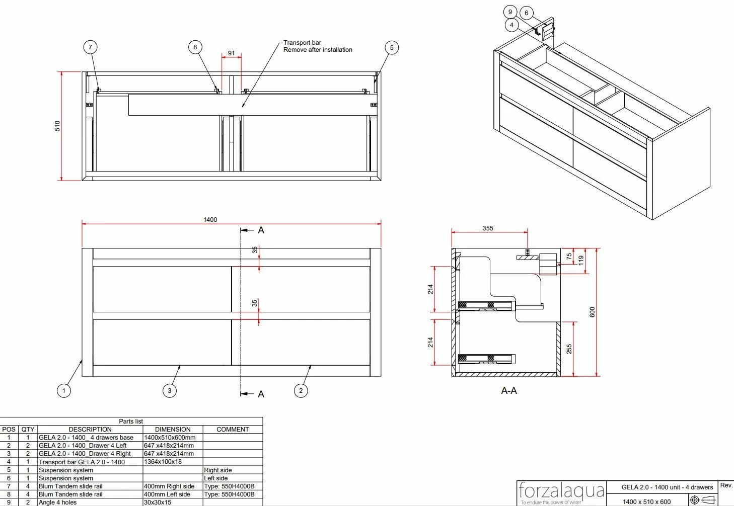 - Afmetingen wastafel: 140.5×51.5×9.5cm