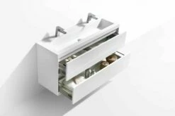 Uitgevoerd in de kleur wit en voorzien van een mineraalmarmer wasbak met 2 kraangaten. De Trend Line greeploze meubels zijn ook beschikbaar in de kleur Century Oak en in verschillende afmetingen.