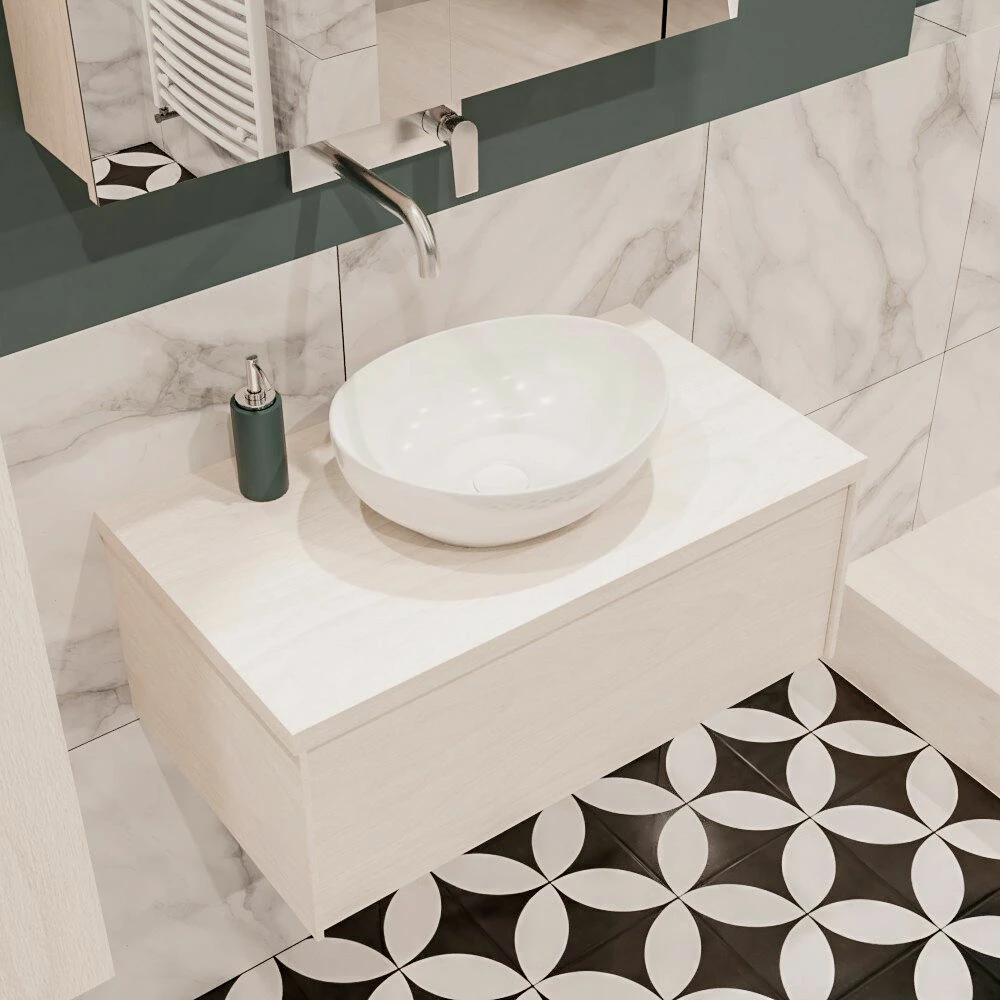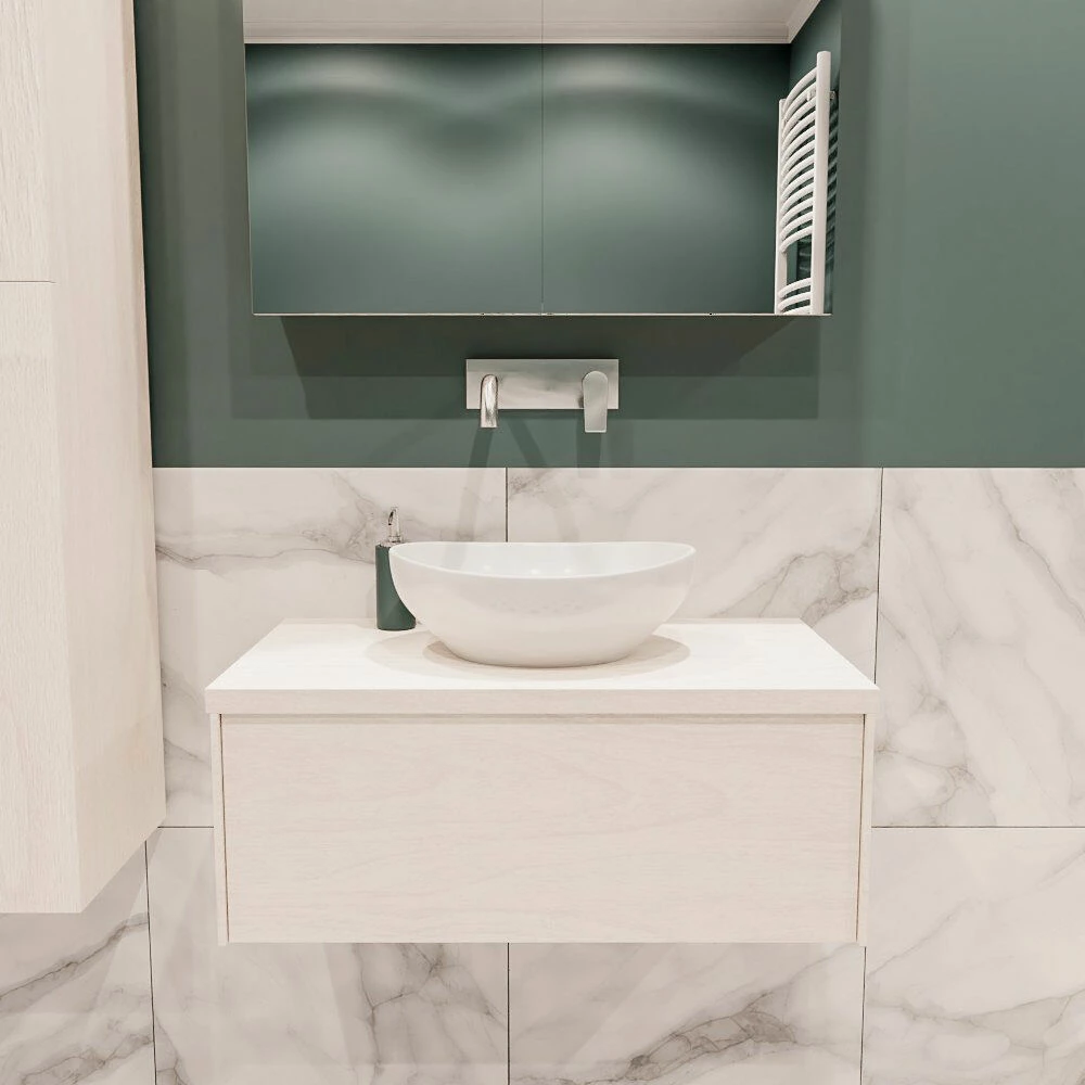 De in Eiken afgewerkte onderkast is gemaakt van MFC, dit is spaanplaat omtrokken met melamine. Uitstekend voor in de badkamer door de waterdichte eigenschappen. De lades zijn greeploos en voorzien van Push-to-open sluitingen.Â