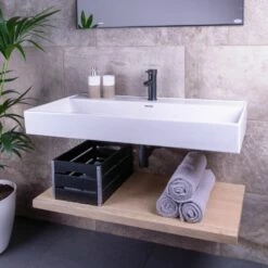 De wastafel is gemaakt van keramiek. De lijnen in de wastafel zijn zeer netjes en strak afgewerkt. Voorzien van 1 kraangat en een forse afzetrand aan de achterzijde voor uw bekertjes en andere spulletjes. Het voordeel van keramiek is dat het super onderhoudsvriendelijk is en krasbestendig is.