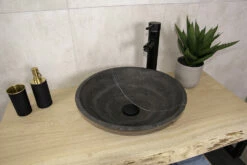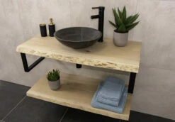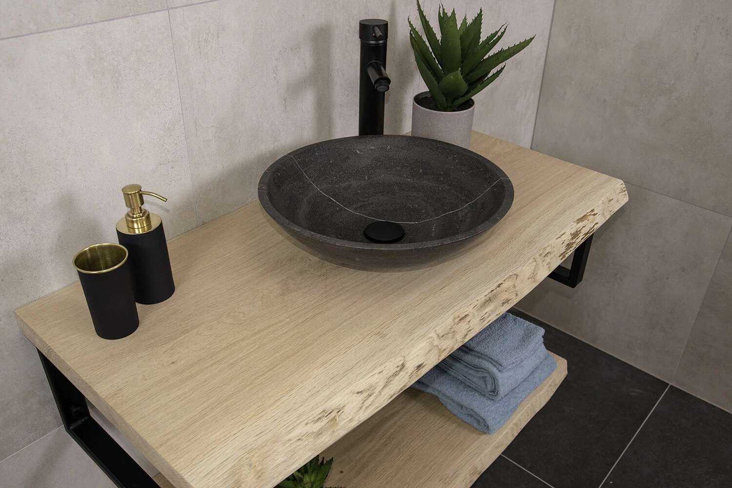 Omdat het meubel zonder gaten geleverd wordt bent u helemaal vrij om zelf de locatie van de natuurstenen waskom te bepalen. Zo kan het meubel met diverse verhoogde wastafelkranen gecombineerd worden of met een inbouw wastafelkraan.