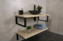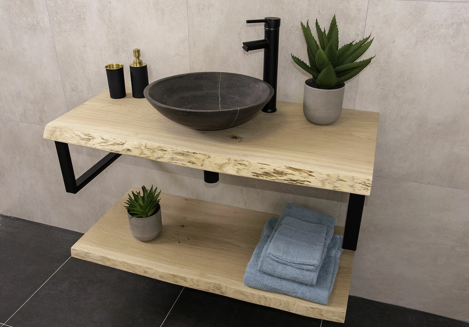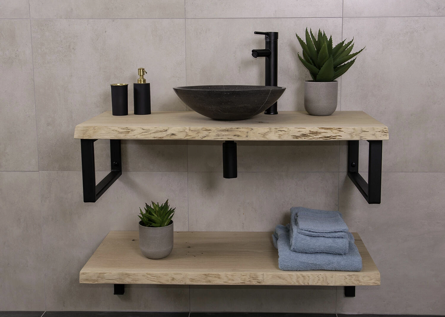 Dit prachtige badmeubel is gemaakt van massief eiken dat gedroogd en geschaafd is. Het meubel wordt onbehandeld geleverd, zodat u zelf kunt kiezen hoe u het wilt afwerken. De voorkant van de wastafelbladen hebben een natuurlijke vorm. De wastafelbladen hebben daarom een diepte van ongeveer 45cm. Het badmeubel 50cm is voorzien van 2 zwarte L-beugels en 2 zwarte handdoekbeugels.