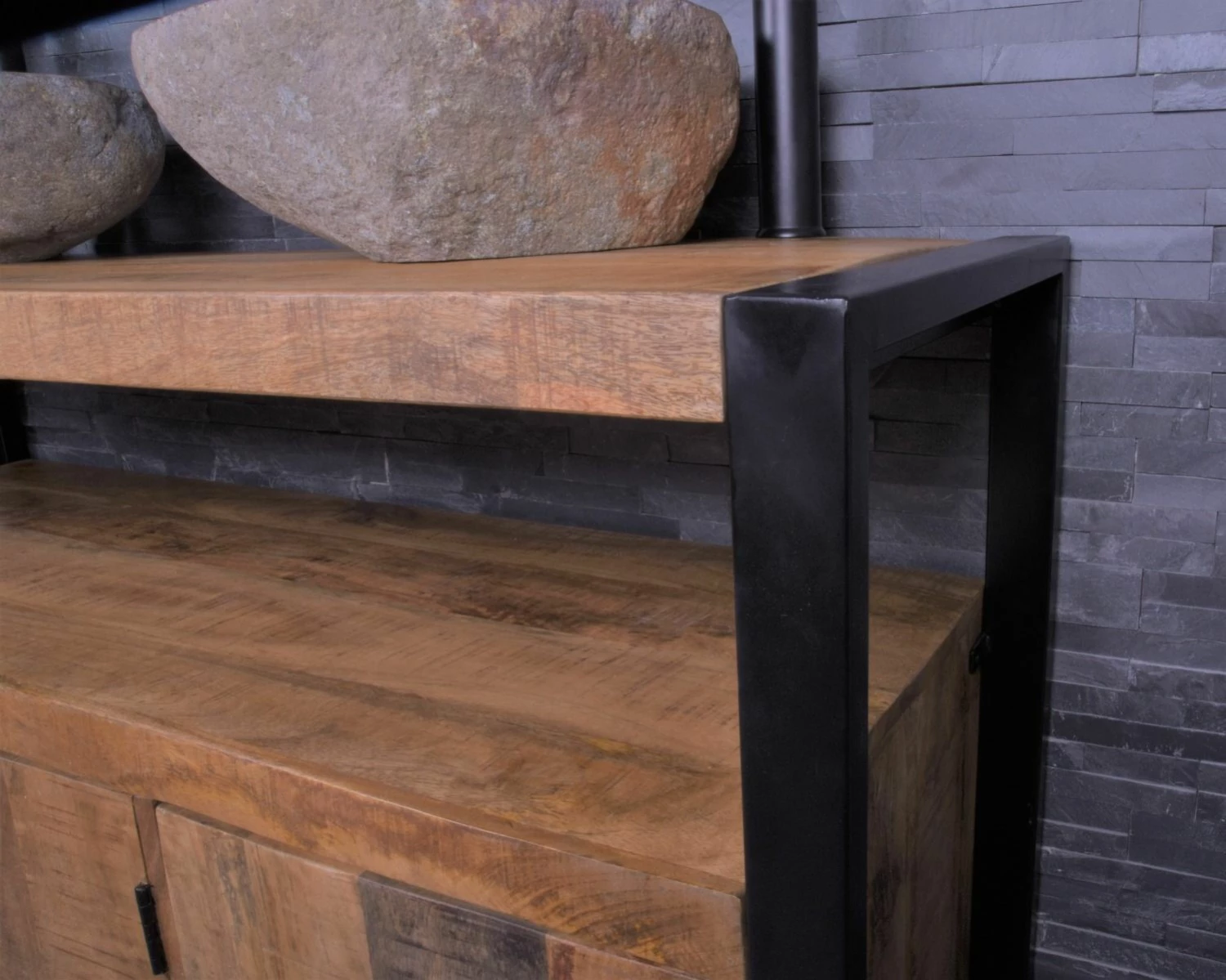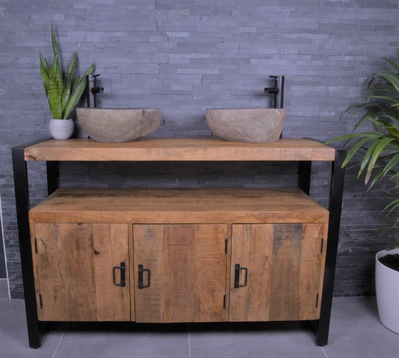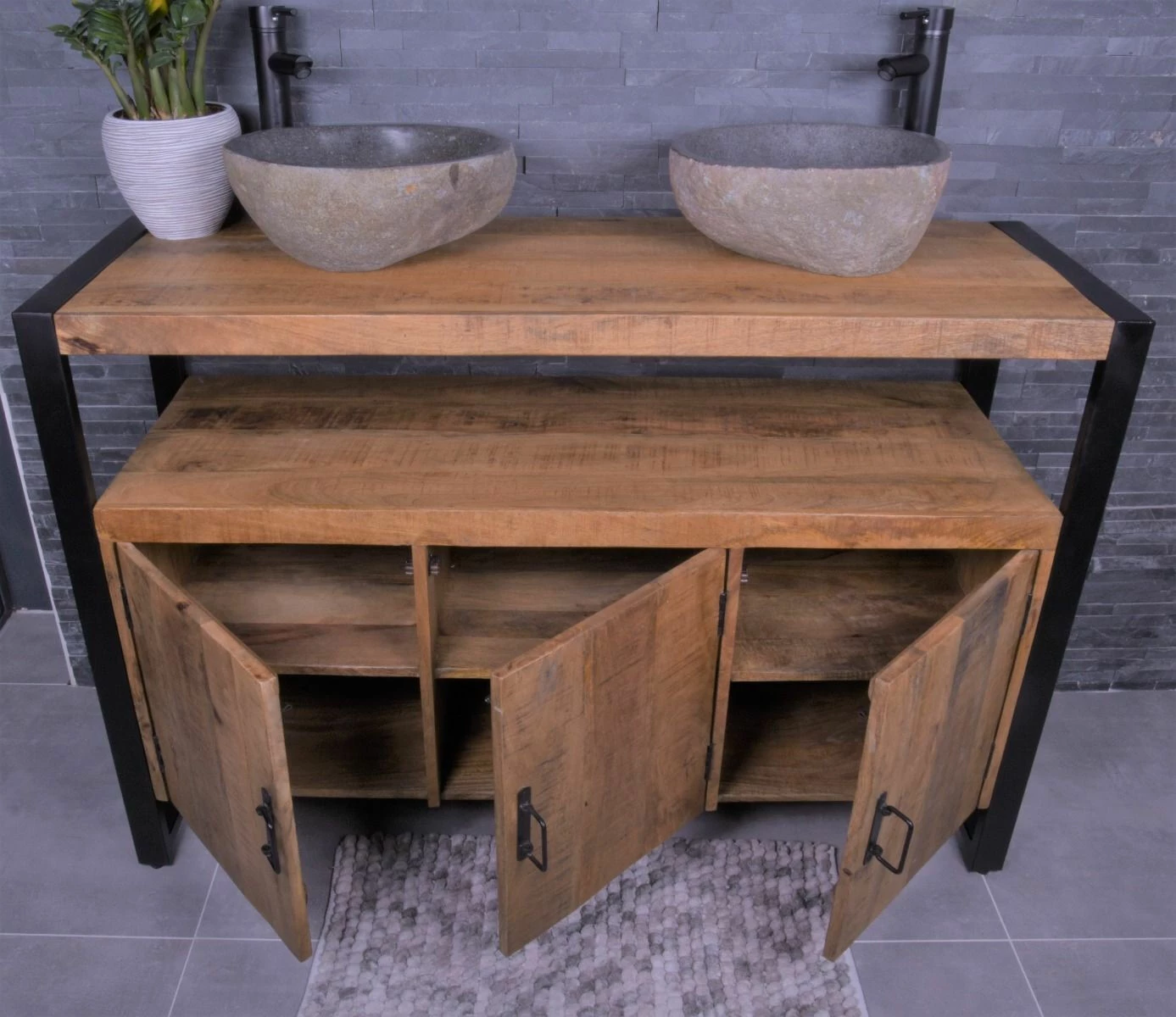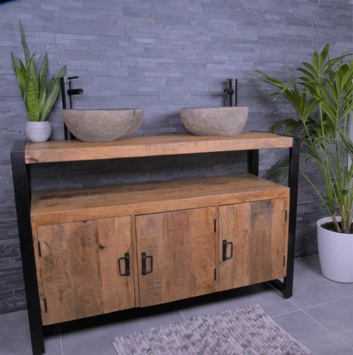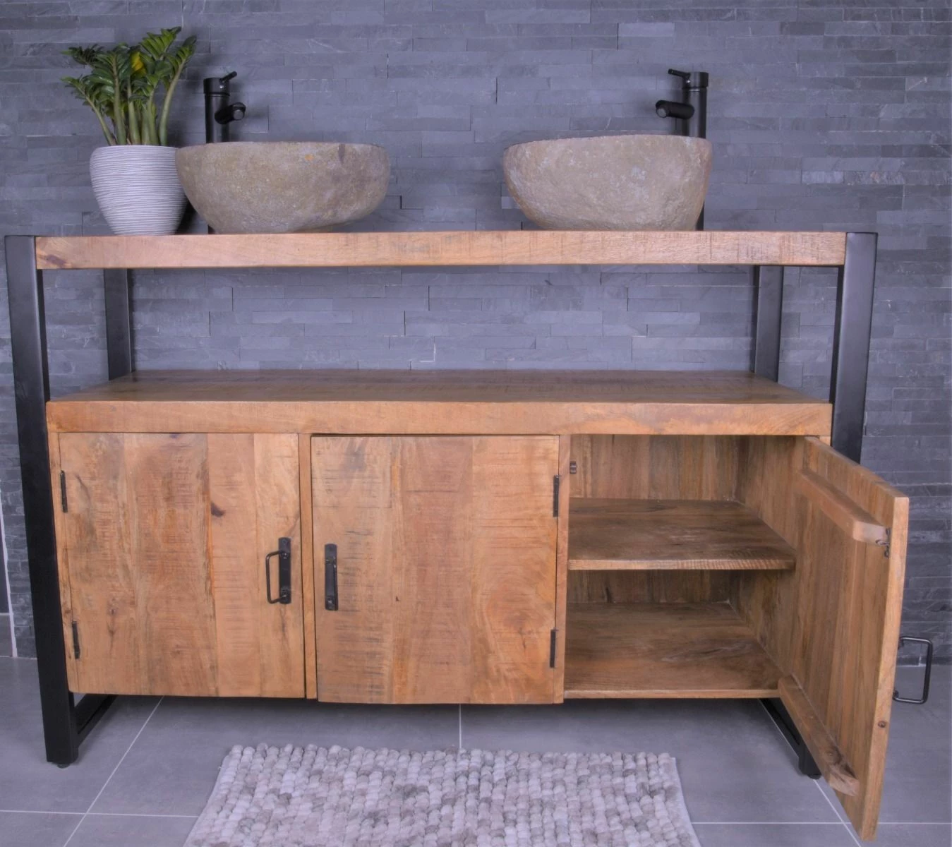 Dit mooie badkamermeubel van MD Interior is gemaakt van het mooie natuurproduct mangohout. Het bestaat uit een dichte kast en een los plateau welke aan elkaar verbonden zijn door middel van twee fraaie zwart gekleurde frames. Het dichte gedeelte van het badmeubel biedt voldoende ruimte voor al je benodigde badkamerspullen. De deuren zijn gemakkelijk te openen en te sluiten door de zwart gekleurde handgrepen.
