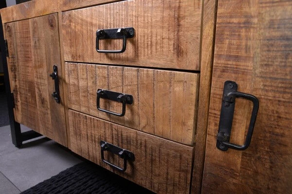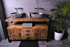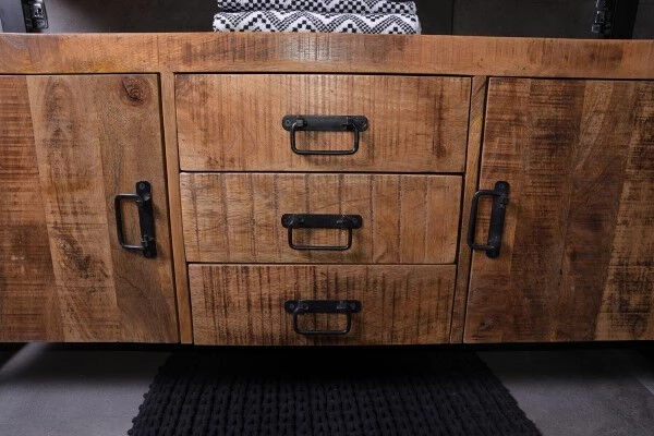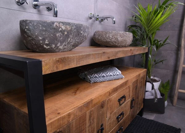 Het badkamermeubel Woodz is gemaakt van massief mangohout, ook de achterkant. Mangohout heeft een zeer warme uitstraling vanwege de bruin- en zwarttinten die erin verwerkt zijn. De structuur is erg divers. Met de zwarte klassieke handgrepen en zwart stalen poten is het helemaal aangepast aan de trend van nu.