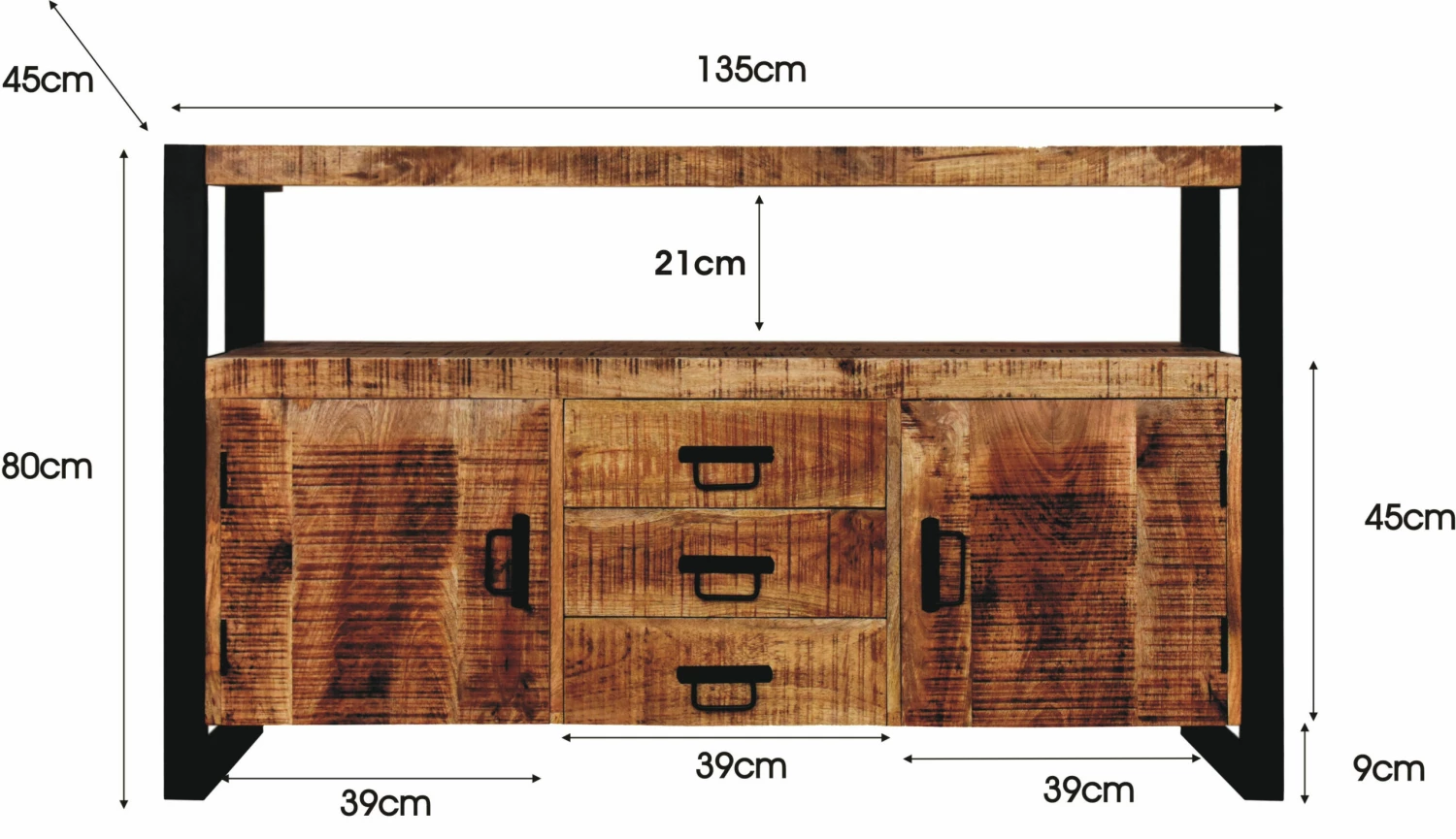 Het meubel is 135cm breed, 45cm diep en 80cm hoog. Deze hoogte is exclusief waskommen. De afstand tussen het topblad en de kastjes bedraagt 21cm.