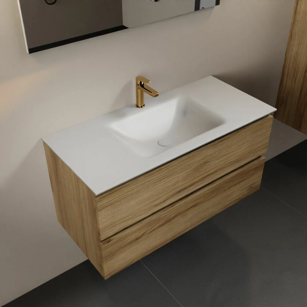 De wastafel is gemaakt van solid surface, duurzaam materiaal met een matte uitstraling wat zorgt voor een luxe look. Solid surface is vlekwerend, vochtbestendig én hygiënisch. Dit materiaal heeft namelijk geen poriën waar vuil zich in kan nestelen, wat het schoonmaken ook een stuk eenvoudig maakt. Een ander pluspunt aan solid surface is dat eventuele kleine krasjes weg te schuren zijn. Kort gezegd is een wastafel van solid surface er dus eentje waar je jarenlang van kan genieten!