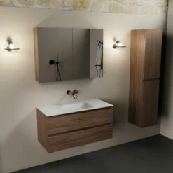 Niet alleen zorgt dit meubel met z’n eiken kleurtje voor een warme sfeer in je badkamer, je hebt ook nog eens genoeg ruimte om al je spullen netjes op te bergen! De onderkast heeft namelijk 2 ruime lades met een hoogte van 25cm. Extra fijn is dat de lades softclose sluiten. Dit betekent dat de lades geleidelijk aan sluiten en dus niet in één keer hard dichtklappen. Beter voor het meubel én je oren! Doordat dit meubel compleet met spiegelkast is, heb je ook in dit kastje nog ruimte om je spullen in op te bergen. Hoe fijn is dat!? Om ‘m nog net dat beetje extra te geven, hebben de lades en zijkant van de spiegelkast een voelbare houtstructuur. Gaaf!