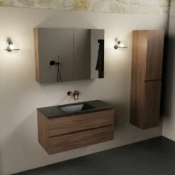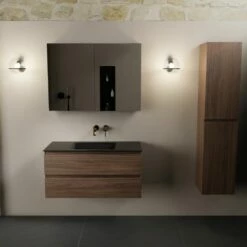 Niet alleen zorgt dit meubel met z’n eiken kleurtje voor een warme sfeer in je badkamer, je hebt ook nog eens genoeg ruimte om al je spullen netjes op te bergen! De onderkast heeft namelijk 2 ruime lades met een hoogte van 25cm. Extra fijn is dat de lades softclose sluiten. Dit betekent dat de lades geleidelijk aan sluiten en dus niet in één keer hard dichtklappen. Beter voor het meubel Ă©n je oren! Doordat dit meubel compleet met spiegelkast is, heb je ook in dit kastje nog ruimte om je spullen in op te bergen. Hoe fijn is dat!? Om ‘m nog net dat beetje extra te geven, hebben de lades en zijkant van de spiegelkast een voelbare houtstructuur. Gaaf!