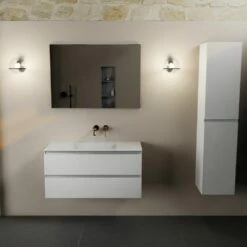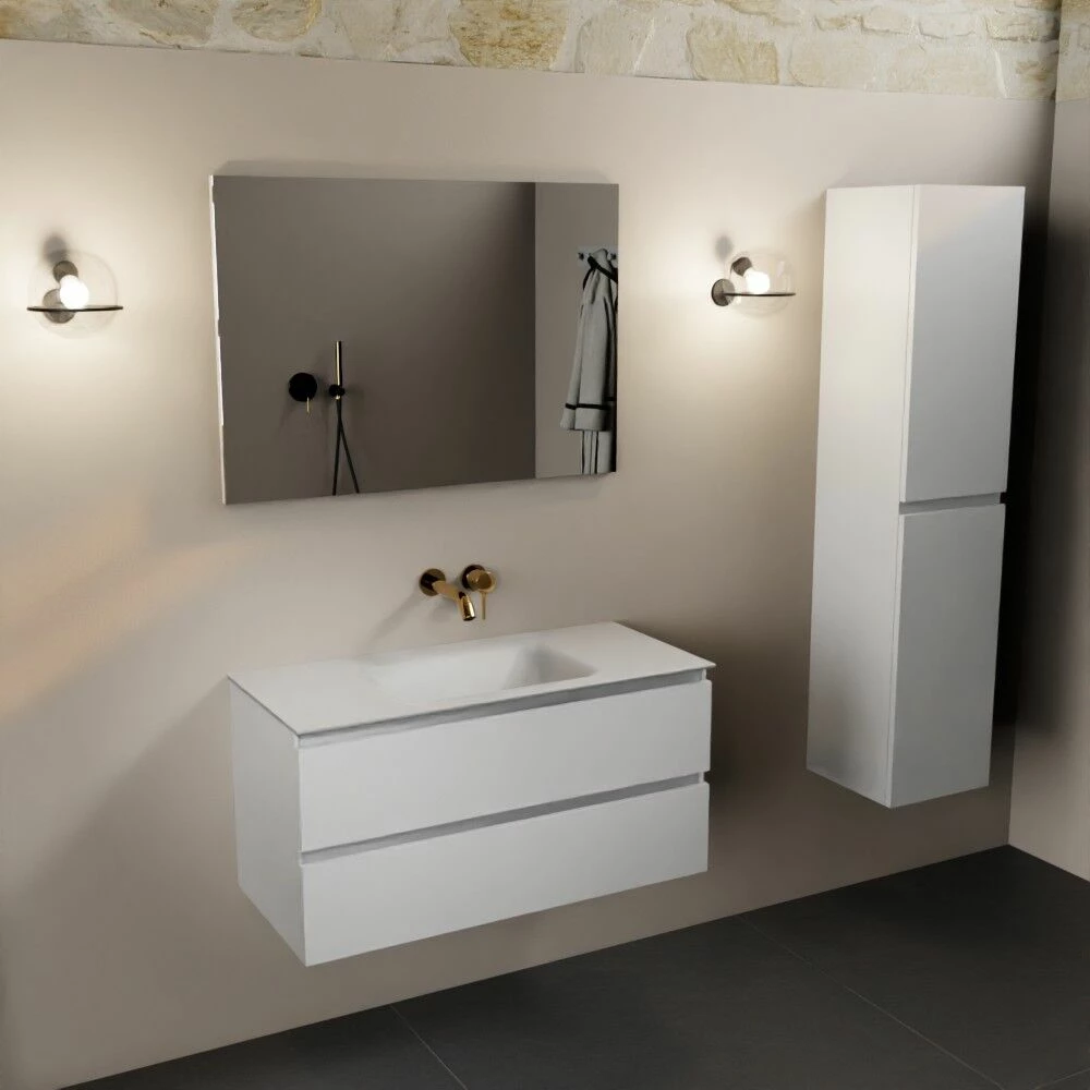 De wastafel is gemaakt van solid surface, duurzaam materiaal met een matte uitstraling wat zorgt voor een luxe look. Solid surface is vlekwerend, vochtbestendig én hygiënisch. Dit materiaal heeft namelijk geen poriën waar vuil zich in kan nestelen, wat het schoonmaken ook een stuk eenvoudig maakt. Een ander pluspunt aan solid surface is dat eventuele kleine krasjes weg te schuren zijn. Kort gezegd is een wastafel van solid surface er dus eentje waar je jarenlang van kan genieten!