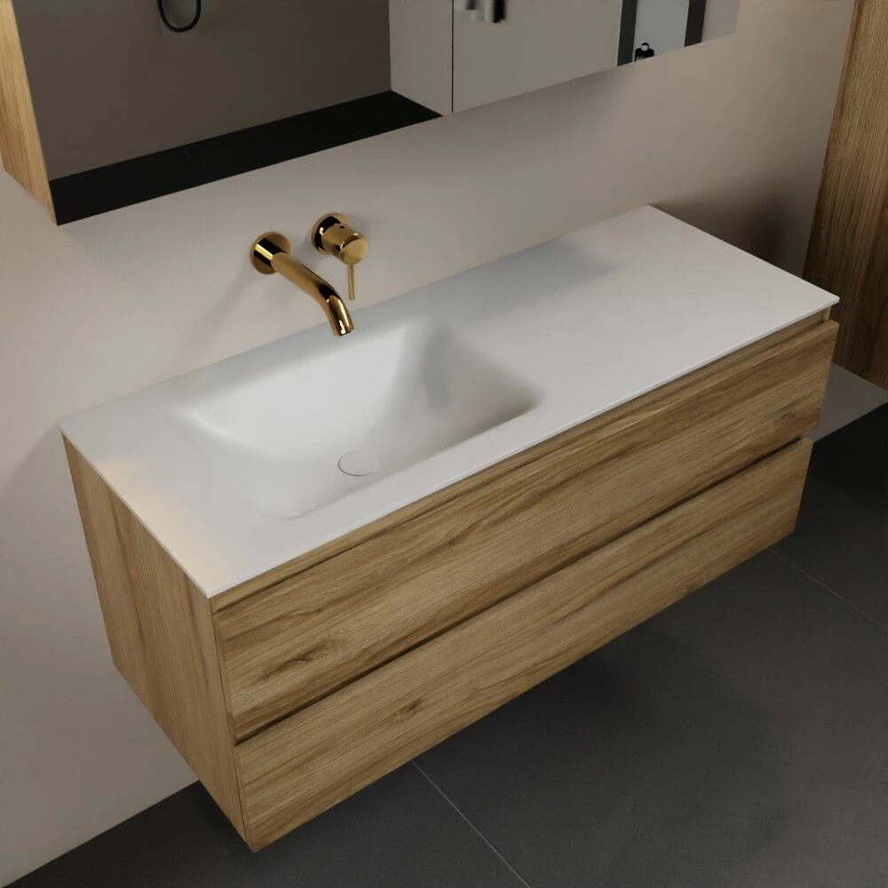 De wastafel is gemaakt van solid surface, duurzaam materiaal met een matte uitstraling wat zorgt voor een luxe look. Solid surface is vlekwerend, vochtbestendig én hygiënisch. Dit materiaal heeft namelijk geen poriën waar vuil zich in kan nestelen, wat het schoonmaken ook een stuk eenvoudig maakt. Een ander pluspunt aan solid surface is dat eventuele kleine krasjes weg te schuren zijn. Kort gezegd is een wastafel van solid surface er dus eentje waar je jarenlang van kan genieten!