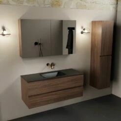 Niet alleen zorgt dit meubel met z’n eiken kleurtje voor een warme sfeer in je badkamer, je hebt ook nog eens genoeg ruimte om al je spullen netjes op te bergen! De onderkast heeft namelijk 2 ruime lades met een hoogte van 25cm. Extra fijn is dat de lades softclose sluiten. Dit betekent dat de lades geleidelijk aan sluiten en dus niet in één keer hard dichtklappen. Beter voor het meubel Ă©n je oren! Doordat dit meubel compleet met spiegelkast is, heb je ook in dit kastje nog ruimte om je spullen in op te bergen. Hoe fijn is dat!? Om ‘m nog net dat beetje extra te geven, hebben de lades en zijkant van de spiegelkast een voelbare houtstructuur. Gaaf!