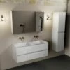Niet alleen zorgt dit meubel voor gave looks, je hebt ook nog eens genoeg ruimte om al je spullen netjes op te bergen! De onderkast heeft namelijk 2 ruime lades met een hoogte van 25cm. Extra fijn is dat de lades softclose sluiten. Dit betekent dat de lades geleidelijk aan sluiten en dus niet in één keer hard dichtklappen. Beter voor het meubel én je oren! Doordat dit meubel compleet met spiegelkast is, heb je ook in dit kastje nog ruimte om je spullen in op te bergen. Hoe fijn is dat!?