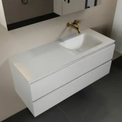 De wastafel is gemaakt van solid surface, duurzaam materiaal met een matte uitstraling wat zorgt voor een luxe look. Solid surface is vlekwerend, vochtbestendig én hygiënisch. Dit materiaal heeft namelijk geen poriën waar vuil zich in kan nestelen, wat het schoonmaken ook een stuk eenvoudig maakt. Een ander pluspunt aan solid surface is dat eventuele kleine krasjes weg te schuren zijn. Kort gezegd is een wastafel van solid surface er dus eentje waar je jarenlang van kan genieten!