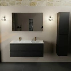 Het badmeubel wordt compleet geleverd met onderkast en wastafel. De zwarte kleur van de onderkast zorgt voor een stoere uitstraling. De wastafel is gemaakt van keramiek, ijzersterk materiaal dat kras- en slijtvast is. Door de gladde structuur van keramiek, is de wastafel ook nog eens hygiënisch. Er zijn namelijk geen gaatjes waar bacteriën zich kunnen nestelen. Ideaal met schoonmaken!