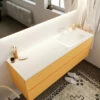 Een frisse touch in je interieur, bij de badkamermeubels van Mondiaz Aivy ben je aan het juiste adres! De serie bestaat uit strakke meubels in verschillende maten, uitvoeringen en kleuren. Dus of je nu gaat voor een stoere look met zwart, tijdloos en strak wit of een warme sfeer met eiken, voor elke badkamer is er dé perfecte Aivy.