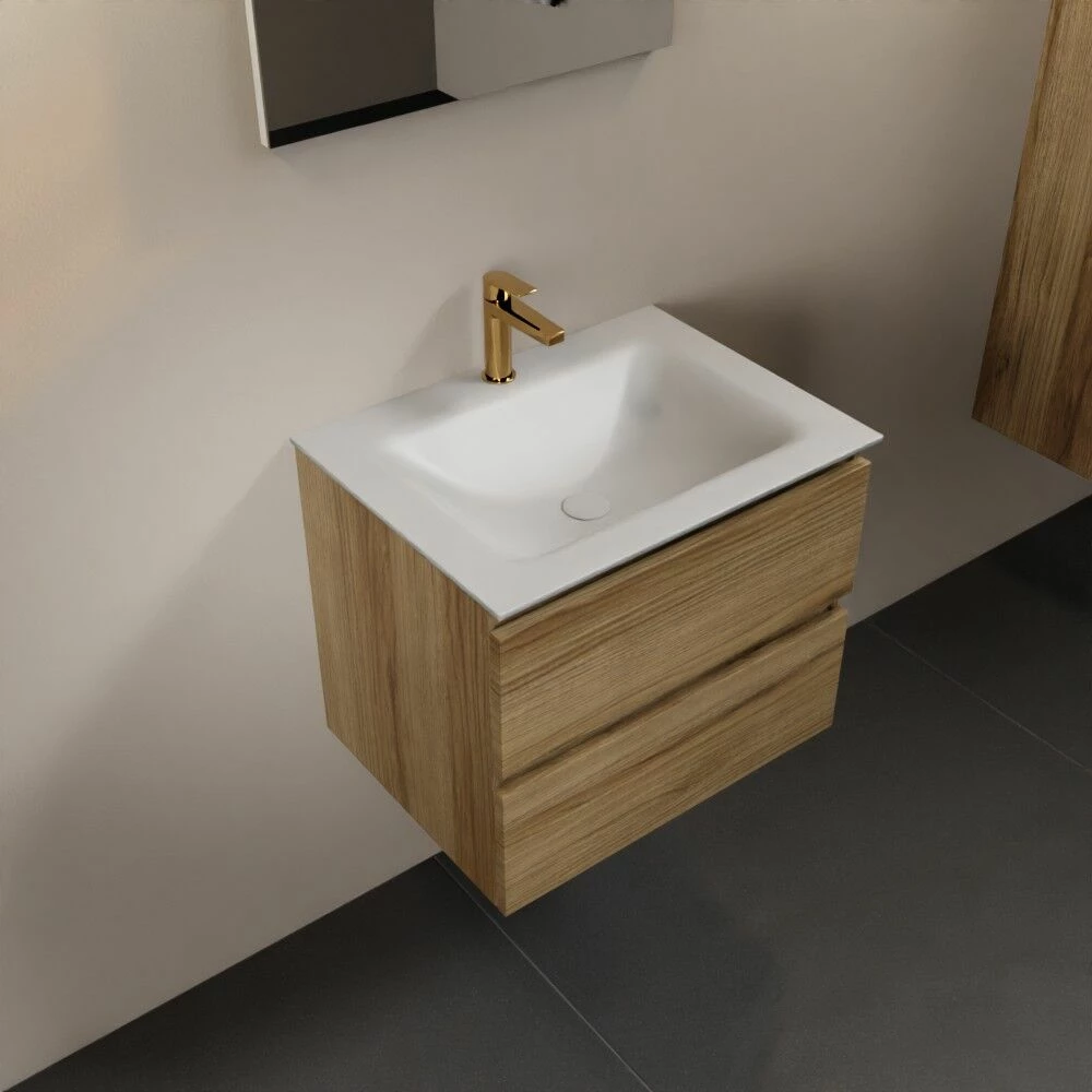 Niet alleen zorgt dit meubel met z’n eiken kleurtje voor een warme sfeer in je badkamer, je hebt ook nog eens genoeg ruimte om al je spullen netjes op te bergen! De onderkast heeft namelijk 2 ruime lades met een hoogte van 25cm. Extra fijn is dat de lades softclose sluiten. Dit betekent dat de lades geleidelijk aan sluiten en dus niet in één keer hard dichtklappen. Beter voor het meubel én je oren! Om ‘m nog net dat beetje extra te geven, hebben de lades een voelbare houtstructuur. Gaaf!