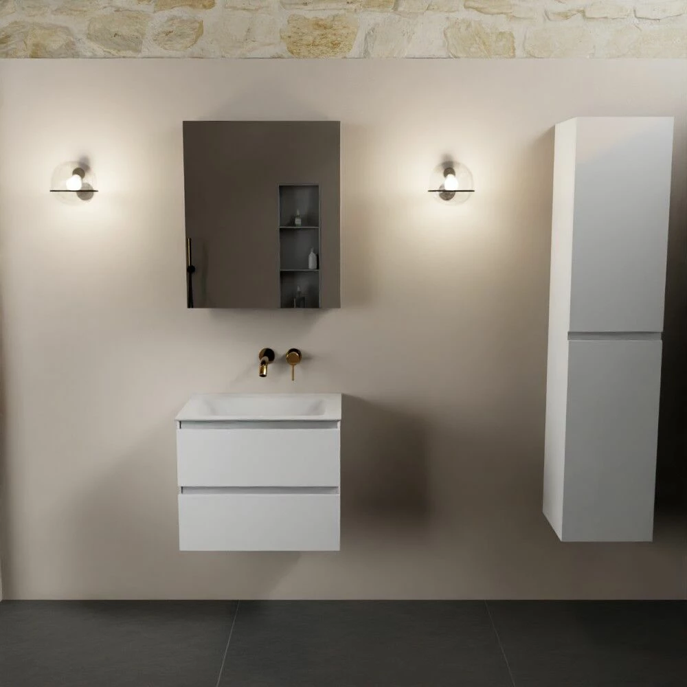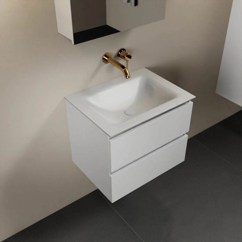 De wastafel is gemaakt van solid surface, duurzaam materiaal met een matte uitstraling wat zorgt voor een luxe look. Solid surface is vlekwerend, vochtbestendig én hygiënisch. Dit materiaal heeft namelijk geen poriën waar vuil zich in kan nestelen, wat het schoonmaken ook een stuk eenvoudig maakt. Een ander pluspunt aan solid surface is dat eventuele kleine krasjes weg te schuren zijn. Kort gezegd is een wastafel van solid surface er dus eentje waar je jarenlang van kan genieten!