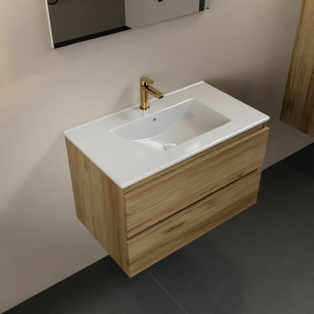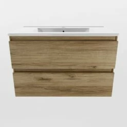 Het badmeubel wordt compleet geleverd met onderkast en wastafel. De eiken kleur van de onderkast zorgt voor een warme sfeer in je badkamer. De wastafel is gemaakt van keramiek, ijzersterk materiaal dat kras- en slijtvast is. Door de gladde structuur van keramiek, is de wastafel ook nog eens hygiënisch. Er zijn namelijk geen gaatjes waar bacteriën zich kunnen nestelen. Ideaal met schoonmaken!