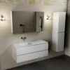 Het badmeubel wordt compleet geleverd met onderkast, wastafel en spiegelkast. De witte kleur van de onderkast zorgt voor een strakke en rustige uitstraling, helemaal in combinatie met de glanzend witte wastafel. De wastafel is gemaakt van keramiek, ijzersterk materiaal dat kras- en slijtvast is. Door de gladde structuur van keramiek, is de wastafel ook nog eens hygiënisch. Er zijn namelijk geen gaatjes waar bacteriën zich kunnen nestelen. Ideaal met schoonmaken!