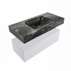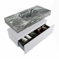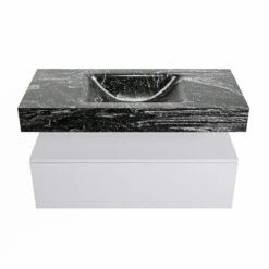 De wastafel is afgewerkt in een marmeren kleur, wat zorgt voor een elegante look. Doordat de wastafel gemaakt is van solid surface, heeft hij een strakke lijnafwerking. Naast de looks, heeft dit sterke materiaal ook veel praktische voordelen. Solid surface is namelijk vochtbestendig en heeft geen poriën waar vuil in kan zitten. Ook is het eenvoudig te reinigen met een natte doek. Mooi én hygiënisch dus!
