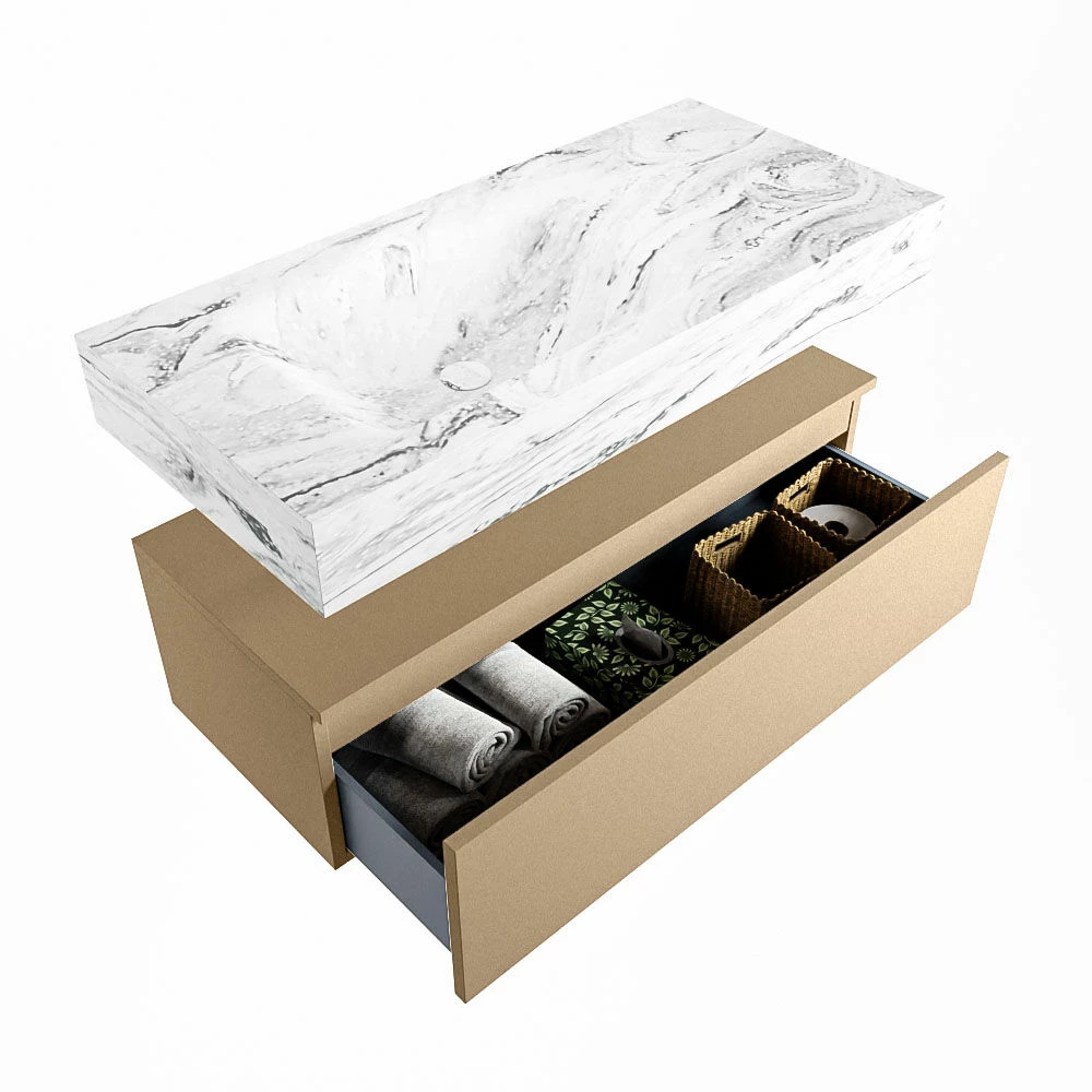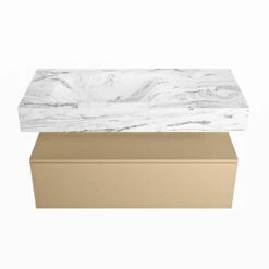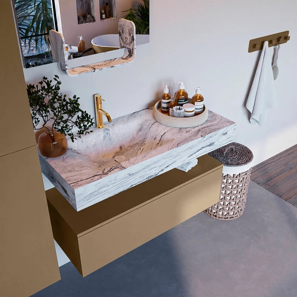 De wastafel is afgewerkt in een marmeren kleur, wat zorgt voor een elegante look. Doordat de wastafel gemaakt is van solid surface, heeft hij een strakke lijnafwerking. Naast de looks, heeft dit sterke materiaal ook veel praktische voordelen. Solid surface is namelijk vochtbestendig en heeft geen poriën waar vuil in kan zitten. Ook is het eenvoudig te reinigen met een natte doek. Mooi én hygiënisch dus!