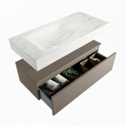 De wastafel is afgewerkt in een marmeren kleur, wat zorgt voor een elegante look. Doordat de wastafel gemaakt is van solid surface, heeft hij een strakke lijnafwerking. Naast de looks, heeft dit sterke materiaal ook veel praktische voordelen. Solid surface is namelijk vochtbestendig en heeft geen poriën waar vuil in kan zitten. Ook is het eenvoudig te reinigen met een natte doek. Mooi én hygiënisch dus!